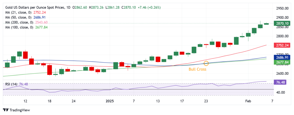日线图继续警告黄金买家,因为 14 天相对强弱指数 (RSI) 仍处于极度超买区域,目前接近 76.50。话虽如此,如果金价持续跌破 2850 美元的水平,则有回调的风险。如果抛售压力加剧,金价可能挑战 2800 美元的整数关口,跌破该关口将测试 2 月 3 日的低点 2772 美元。不过,50 日简单移动平均线 (SMA) 和 100 日 SMA 金叉让买家保持希望,而金价周三也成功收于 2850 美元的心理关口上方。