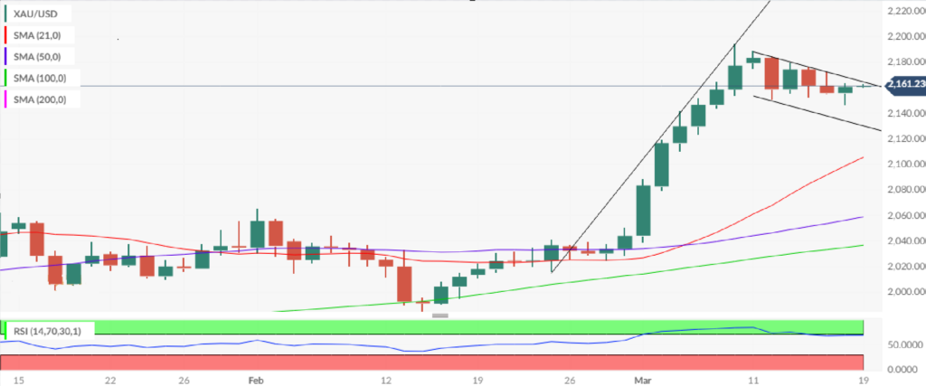 黄金价格的短期技术面前景大致保持不变,日线收盘价在下跌趋势线阻力位2164美元上方等待金叉确认。高于后者的接受度将触发向2190美元的新上升,高于该水平的创纪录高点2195美元将被重新测试。下一个相关的看涨目标见于2200美元的门槛和2250美元的心理水平。14日RSI指数位于超买区域下方,接近68,表明金价可能即将迎来新一轮上涨。