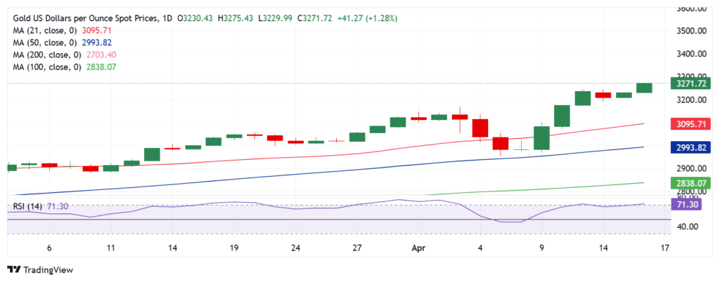 日线图显示,14日相对强弱指数(RSI)已重新进入超买区域,目前接近71,买家需谨慎。如果日收盘价能维持在3,275美元上方,则测试3,300美元关口将不可避免,从而打开通往3,350美元心理关口的大门。