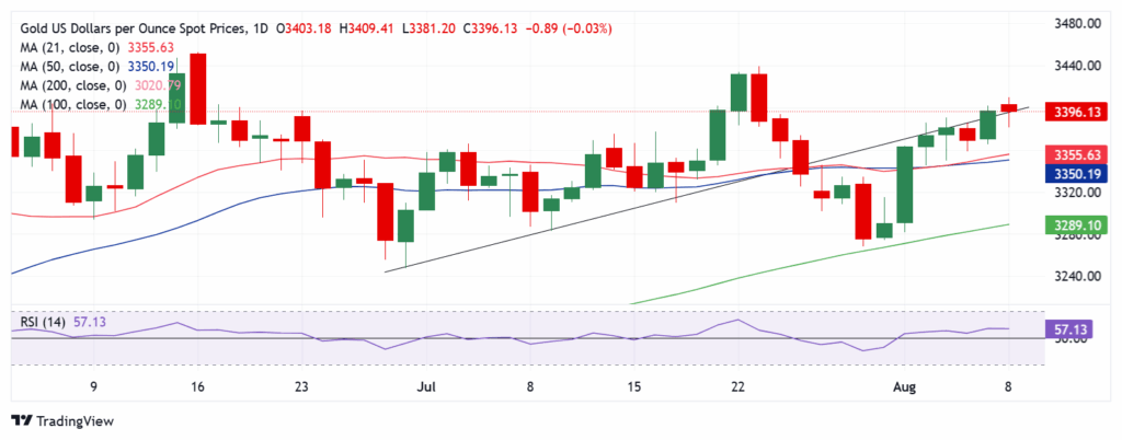 Gold price is seeing a sharp pullback after hitting fresh two-week highs near $3,410 early Friday. Traders digest the latest tariff headlines as the bright metal heads for a second straight weekly advance.