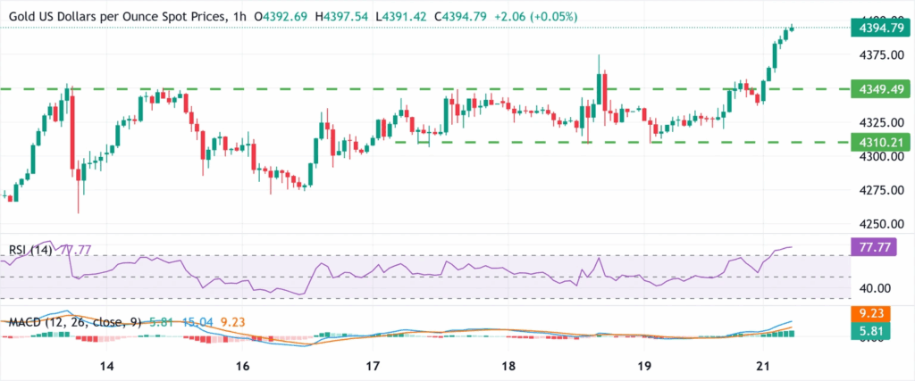 Against the backdrop of back-to-back rebounds from the $4,310-$4,305 area over the past two days, a convincing breakout through the $4,345-4,3450 region could be seen as a key trigger for bullish traders. However, the RSI is flashing overbought conditions on hourly and daily charts. This, in turn, makes it prudent to wait for some near-term consolidation or a modest pullback before positioning for any further appreciating move.