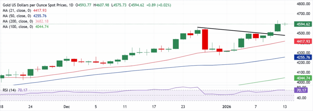 Gold is treading water near the $4,600 threshold early Tuesday, as buyers catch a breather after Monday’s rally to fresh record highs of $4,630. All eyes now turn to the US CPI inflation data due later in the North American Session for fresh trading impetus.