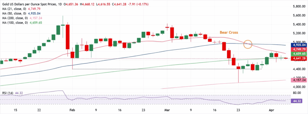 The metal holds a broadly bearish near-term bias as it remains entrenched below the 21-day simple moving average (SMA) at $4,774.95 and the 50-day SMA at $4,935, keeping the recent rebound capped within a corrective context. Momentum aligns with this tone, with the Relative Strength Index (14) hovering around 45, suggesting subdued buying interest after the earlier oversold bounce. The bearish bias also remains justified by a Bear Cross in play. The 21-day SMA closed below the 50-day SMA on March 25, confirming the bearish crossover.