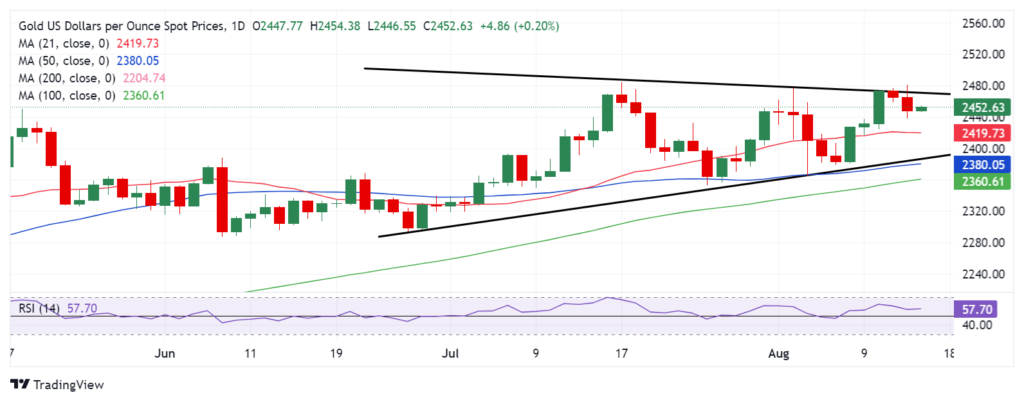 从日线图上可以看出,对称三角形的上边界接近 2,470 美元,对黄金买家来说仍然是一块难啃的骨头。如果反弹势头增强,则需要日收盘价高于该水平才能确认三角形突破。14 天相对强弱指数RSI坚守在 50 水平之上,这增加了对黄金价格建设性前景的信心。下一个上行目标在历史高点 2,484 美元,高于该水平将考验 2,500 美元大关。