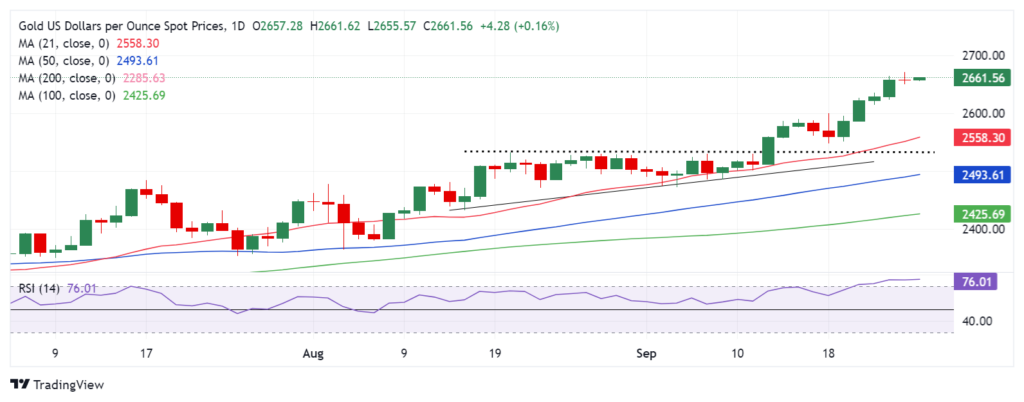 Harga emas memperpanjang mode konsolidatif tepat di bawah rekor tertinggi yang dicapai di dekat $2670 pada hari Rabu, karena para pembeli menjadi berhati-hati menjelang serangkaian pidato dari para pembuat kebijakan Federal Reserve (Fed) AS yang akan dirilis pada hari Kamis.
