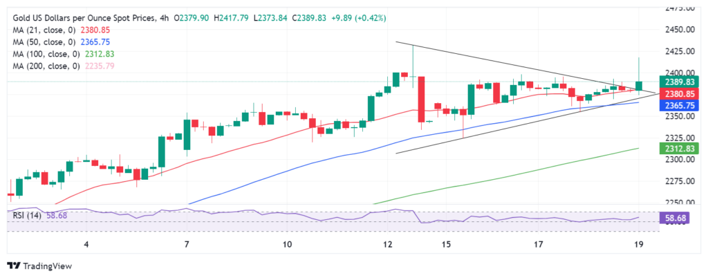 金价正在从周四早些时候四小时图表上绘制的对称三角形向上突破,等待收于 2381 美元上方以验证看涨突破。在此水平上,21 小时简单移动平均线 (SMA) 对齐,使其成为强大的阻力位。