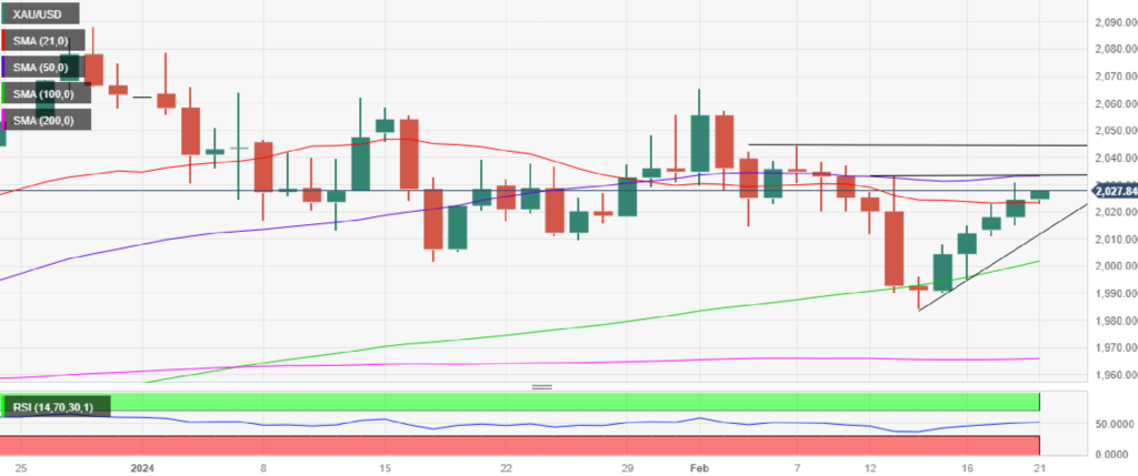 从日线图上可以看出,周二金价最终收于 21 日简单移动平均线上方,目前为2023 美元。14 天RSI将反弹延续至中线上方,表明趋势可能已转向有利于黄金买家。因此,目前的直接阻力位是2033 美元,即 50日移动平均线和 2月13日高点重合的位置。持续突破该水平将为金价带来新的买入机会,目标是2月7日高点 2044 美元和 2050 美元心理关口。