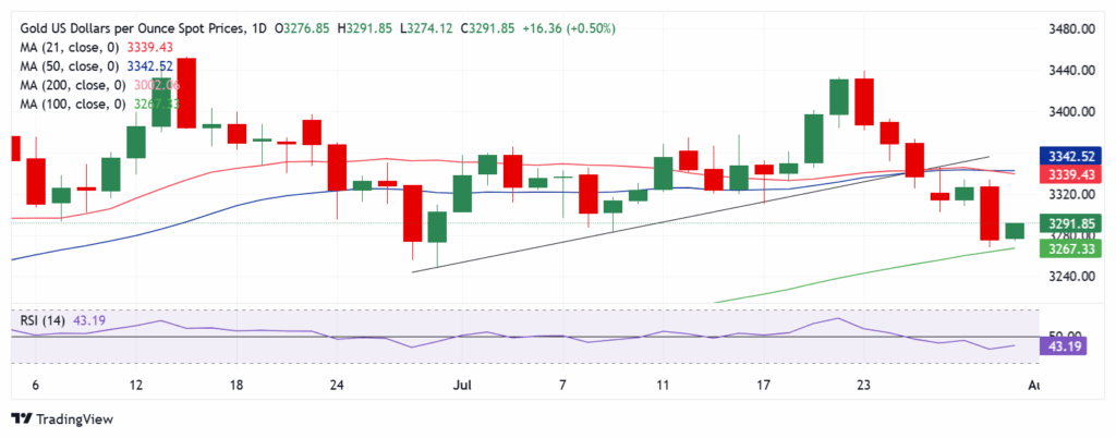 Harga emas memantul dari support SMA 100 hari di $3,267, namun pengaturan teknikal harian tetap bearish.