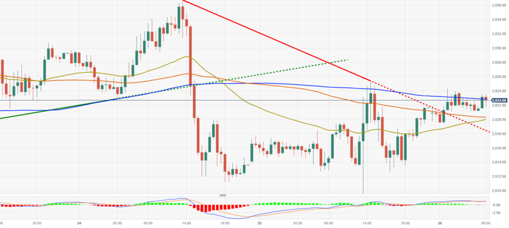 金价周四小幅走高,因美国GDP数据显示通胀速度下降后,美债收益率下跌,金价继周四上涨。现货黄金上涨0.2%,当前触及2020上方,继续紧守在2000美元关口之上。