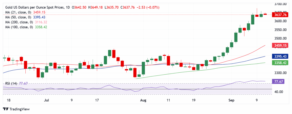 Emas telah memasuki fase konsolidasi naik di bawah level tertinggi sepanjang masa di $3,675 di perdagangan Asia pada hari Kamis, setelah comeback yang layak pada hari Rabu.
