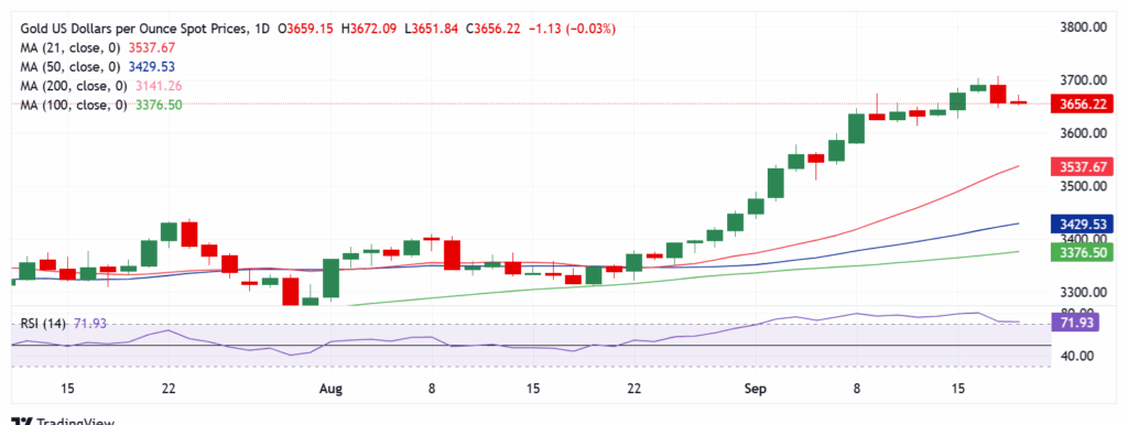 Emas menjilati lukanya di dekat $3,650 pada perdagangan Asia hari Kamis, setelah menghentikan kemundurannya dari rekor tertinggi baru di $3,707 yang dicapai sebagai reaksi awal terhadap pengumuman kebijakan Fed AS.