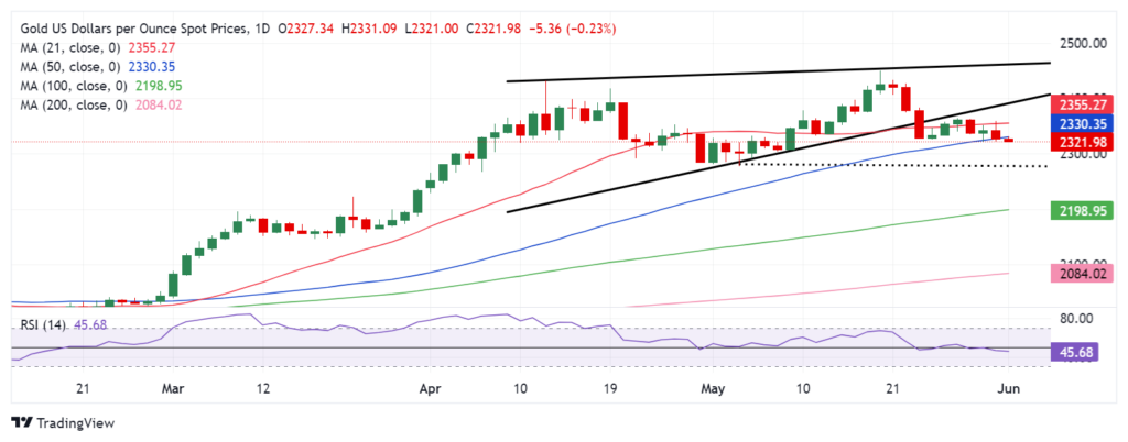 或者,任何反弹都需要突破 21日 SMA 2355 美元。再往上,5 月 24 日的高点 2364 美元将发挥作用。持续突破该水平将推动金价向上升楔形支撑位转为阻力位,即 2391 美元。