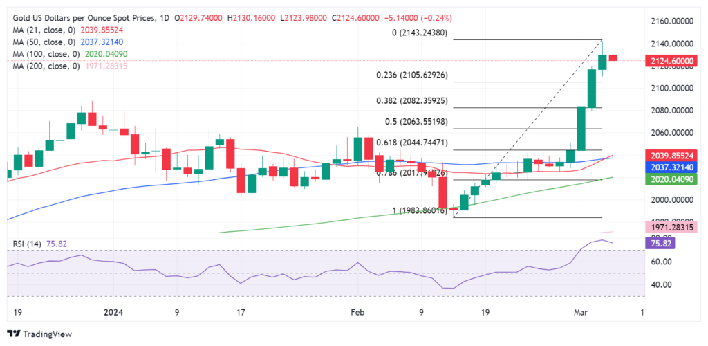 如果发生这种情况,2107美元的支撑位将是守住的关键。这个水平是最近从2月14日的低点1984美元到2024年的高点2142美元反弹的23.6%的斐波那契回撤位。低于后者的接受度可能会引发新的下跌,跌向38.2%的斐波那契支撑位2082美元。