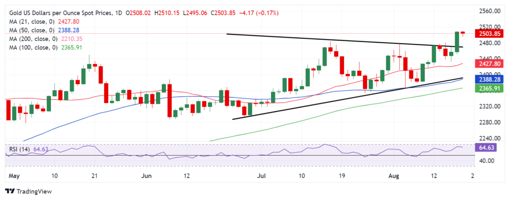 周一早盘,金价在 2.500 美元附近挣扎,刷新了 2.510 美元的历史高点。黄金交易员倾向于获利了结,在本周晚些时候美联储7 月会议纪要和主席鲍威尔讲话之前重新定位。