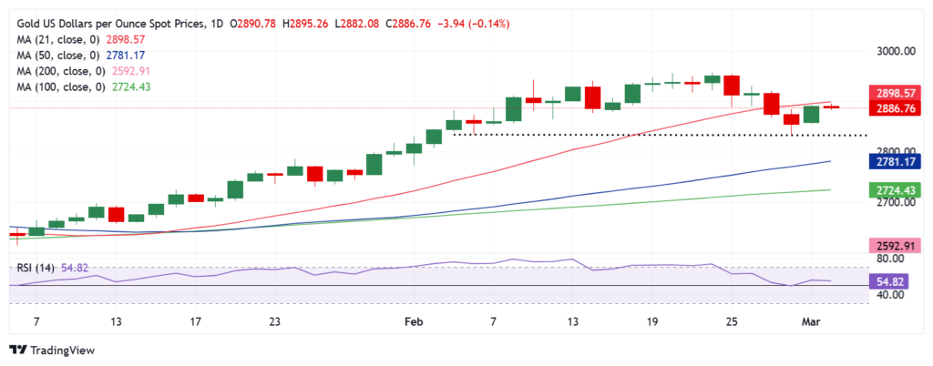 日线图显示,金价在 21 日简单移动平均线 (sma) 2,900 美元处停滞了最新上涨势头,只有在日每日蜡烛图收盘高价于该水平时,金价才有可能获得反弹相对强弱指数 (rsi) 略走有低,但仍远高于 50, 水平上行趋势保持不变、900 美元持续突破,2 月 26 日高点 2,930 美元将成为他们的目标。