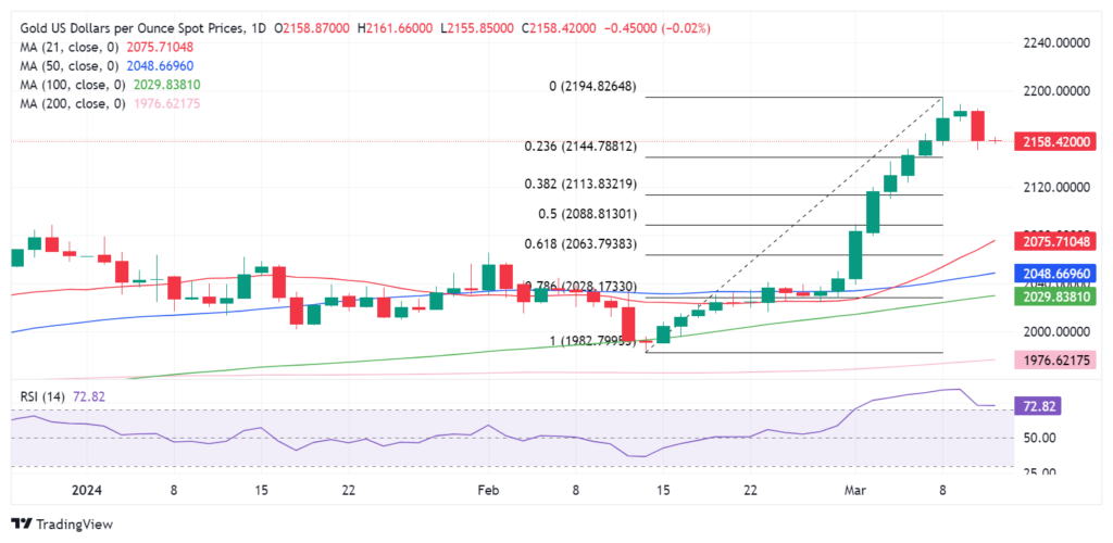 Ngoài ra, giá vàng đã tìm thấy mức hỗ trợ mạnh mẽ trên mức 2.145 USD, đây là mức thấp nhất vào ngày 7/3 và cũng là mức thoái lui Fibonacci 23.61% của đợt tăng giá từ mức thấp nhất ngày 14/2 (1.984 USD) đến mức cao nhất lịch sử (2.195 USD).Việc giữ vững mức này là yếu tố quan trọng để khôi phục xu hướng tăng hướng tới mức cao nhất vào thứ Ba là 2.185 USD. Nếu vượt qua mức này, giá vàng sẽ tái kiểm tra mức cao lịch sử 2.195 USD. Mục tiêu tăng giá tiếp theo nằm ở ngưỡng 2.200 USD và mức tâm lý 2.250 USD.