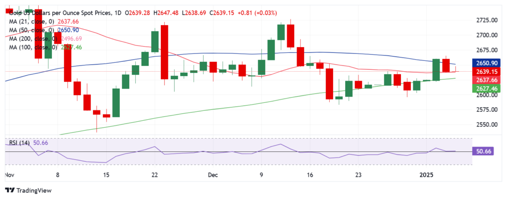 从技术角度来看,日线图显示,14 日相对强弱指数 (RSI) 仍高于 50水平,支持金价的看涨倾向。与此同时,金价在周五未能维持在 50 日移动平均线 2.651美元上方,目前守住了 21 日移动平均线 (SMA) 2,638 美元。只要 21 50 2.665 美元,在此之上 2.700 美元的水平将发挥作用。