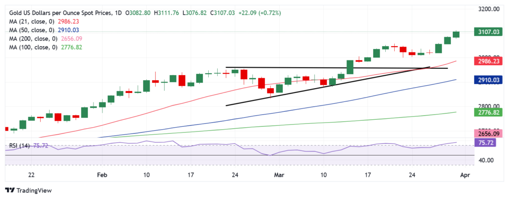 周一亚洲时段,金价继续上涨,创下远高于 3.100美元大关的又一个历史新高。由于对潜在全球贸易战及其经济影响的担忧加剧,黄金买家仍未受到阻碍。