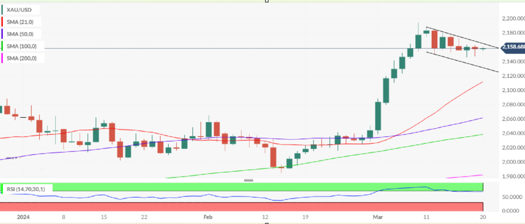 Triển vọng kỹ thuật ngắn hạn của giá vàng cơ bản không thay đổi, đang chờ giá đóng cửa trên đường kháng cự xu hướng giảm tại mức 2165 USD trên biểu đồ hàng ngày để xác nhận mô hình tăng giá. Một khi phá vỡ mức kháng cự này, giá vàng sẽ kích hoạt đợt tăng giá mới,với mục tiêu hướng tới mức 2.190 USD, sau đó sẽ kiểm tra lại mức cao lịch sử 2.195 USD. Các mục tiêu tăng giá tiếp theo sẽ xuất hiện tại ngưỡng 2.200 USD và mốc tâm lý 2.250 USD. Chỉ số RSI 14 ngày hiện nằm dưới vùng quá mua, gần mức 68.00, cho thấy giá vàng có thể sắp bước vào một đợt tăng giá mới.