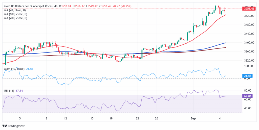 Cặp XAU/USD đã cắt giảm hầu hết các khoản lỗ trong ngày và giao dịch ngay trên mốc $3.550. Biểu đồ hàng ngày cho thấy các chỉ báo kỹ thuật đã giảm nhẹ, nhưng vẫn nằm trong vùng quá mua, cho thấy vàng có thể điều chỉnh giảm hoặc tích lũy trước khi có đợt tăng giá định hướng tiếp theo. Đồng thời, cặp tiền này đang giao dịch trên tất cả các đường trung bình động, với đường SMA 20 đang tăng lên quanh mức $3.398.