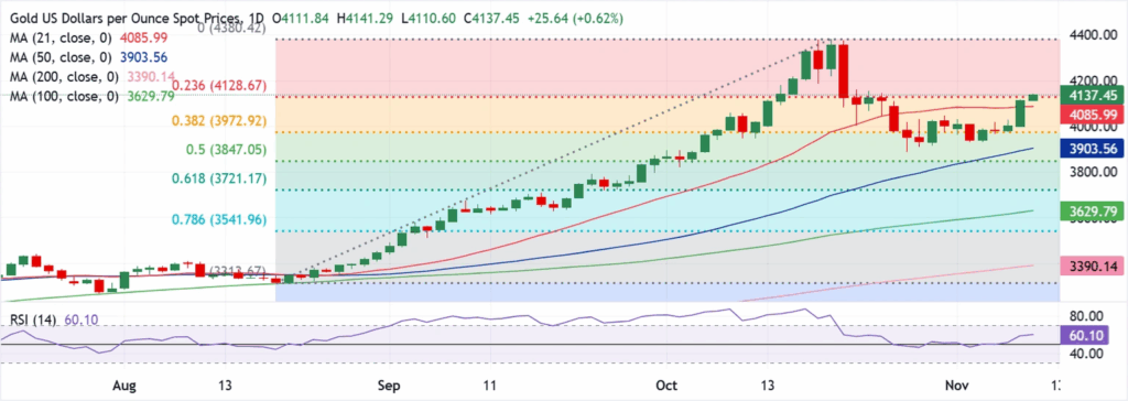 Vàng đang dao động quanh mức $4,150 vào đầu phiên giao dịch thứ Ba, đạt mức cao nhất trong ba tháng qua. Sự chú ý hiện nay tập trung vào báo cáo việc làm hàng tuần của ADP Mỹ trong bối cảnh có khả năng kết thúc tình trạng đóng cửa chính phủ.