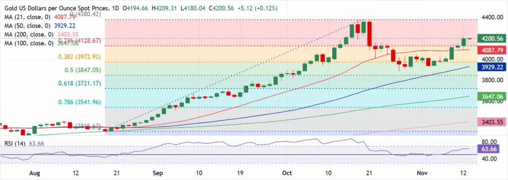 Nhà đầu tư cần giá đóng cửa hàng ngày của nến Nhật vượt qua mốc $4,200 để tiếp tục tăng tốc hướng tới mức tâm lý $4,250.