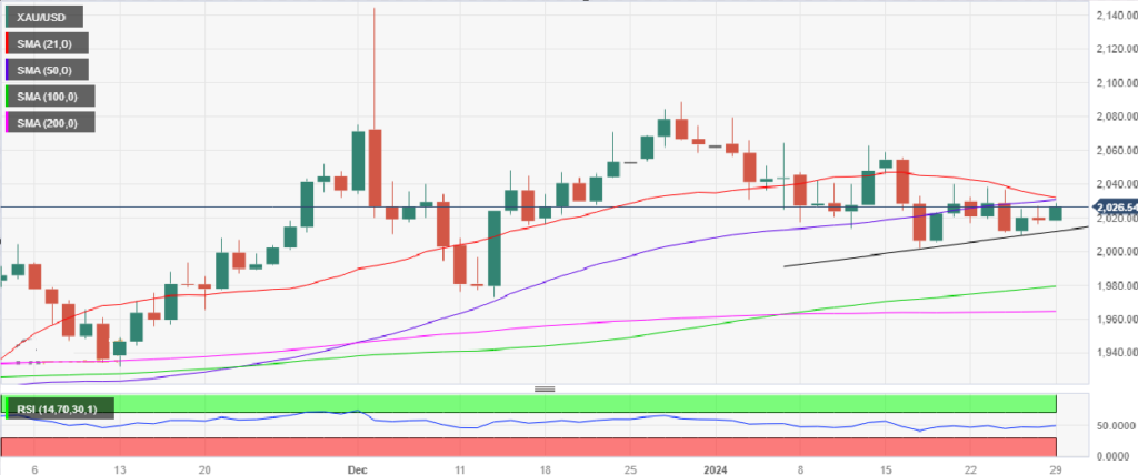 Từ biểu đồ hàng ngày có thể thấy, giá vàng sẽ phá vỡ mức 2.030 USD, tức là điểm giao cắt giữa đường trung bình động 50 ngày và 21 ngày. Tuy nhiên, người mua vàng gặp phải mức kháng cự tĩnh gần 2.038 USD, điều này hạn chế không gian tăng giá của vàng. Chỉ số RSI 14 ngày đã quay trở lại mức trung bình, cung cấp hỗ trợ cần thiết cho người mua vàng.