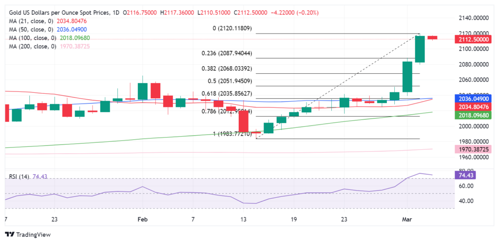 Từ biểu đồ hàng ngày có thể thấy, giá vàng đang điều chỉnh về mức thoái lui Fibonacci 23.61% từ mức thấp nhất ngày 14/2 là 1.984 USD đến mức cao nhất trong ba tháng là 2.120 USD, trùng khớp với mức 2.088 USD. Sự điều chỉnh của giá vàng có thể do chỉ số RSI 14 ngày đang ở trạng thái quá mua.Tuy nhiên, tiềm năng tăng giá của vàng vẫn còn nguyên vẹn, vì đường trung bình động 21 ngày sắp vượt qua đường trung bình động 50 ngày, báo hiệu một sự giao cắt tăng giá sắp xảy ra.