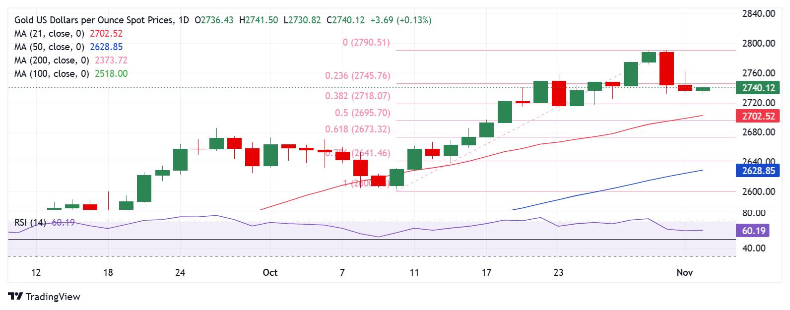 Giá vàng dừng đà điều chỉnh từ mức cao nhất mọi thời đại là $2.790 được thiết lập vào thứ Sáu, do đồng Đô la Mỹ (USD) chịu áp lực bán mạnh, chứng kiến khoảng cách mở cửa giảm giá sau cuộc thăm dò ý kiến mới nhất về cuộc bầu cử Hoa Kỳ được công bố vào thứ Bảy.