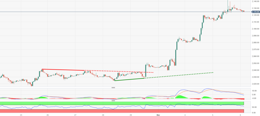 Đánh giá xu hướng:Giá vàng đang tiếp tục điều chỉnh từ mức kỷ lục mới $2,141.59 đạt được vào thứ Ba, khi các nhà giao dịch điều chỉnh vị thế trước phiên điều trần quan trọng của Chủ tịch Fed Powell và dữ liệu việc làm của Mỹ. Các dự đoán gia tăng về việc Fed cắt giảm lãi suất đã đẩy giá vàng lên mức kỷ lục.
