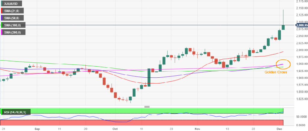50日移动均线(SMA)的周收盘价高于200日移动均线,证实了周五的黄金金叉形态。需要日收盘价高于2100美元水平才能启动持续上升趋势至2200美元大关。在此之前,2044美元的历史高点将成为强劲阻力位。