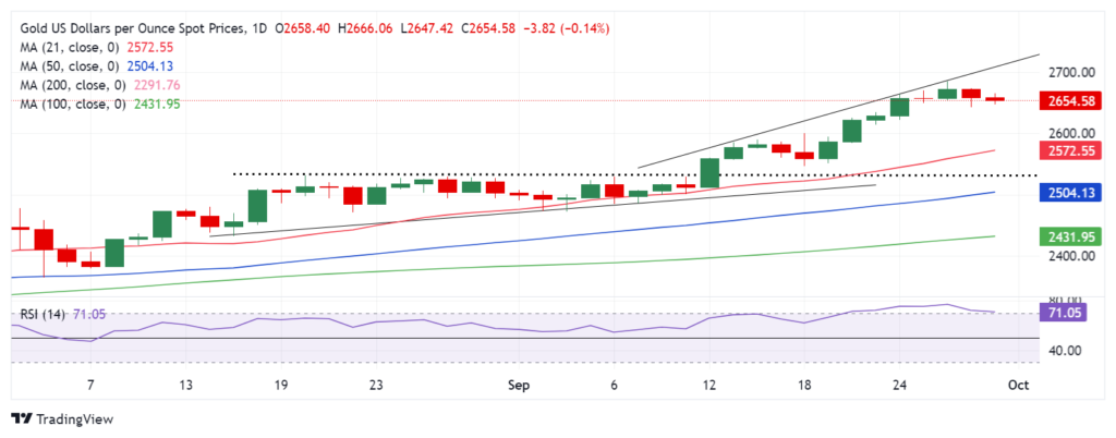 需要在历史高点上方稳固立足,才能突破 2,700 美元的障碍,然后突破 2,710 美元的上升趋势线阻力位。