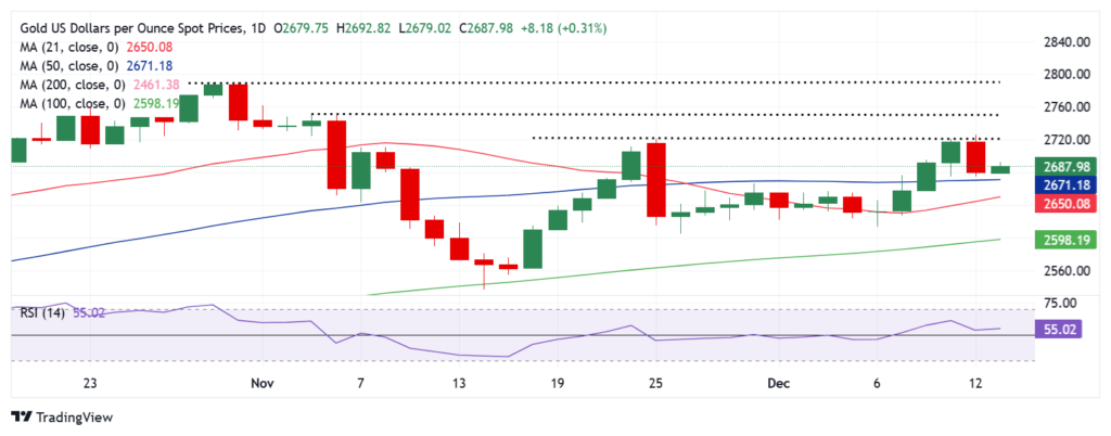 周四,金价在高位遭遇阻力,随后下跌,周五早盘在 50 日简单移动平均线 (SMA) 2,671 美元处找到支撑。14 日相对强弱指数 (RSI) 也再次出现上行,并保持在 50 水平上方。如果金价恢复复苏势头,可能会重新测试数周高点 2,726 美元,而在此之上,心理障碍和 11 月 5 日高点的交汇点 2,750 美元将成为一块难啃的骨头。