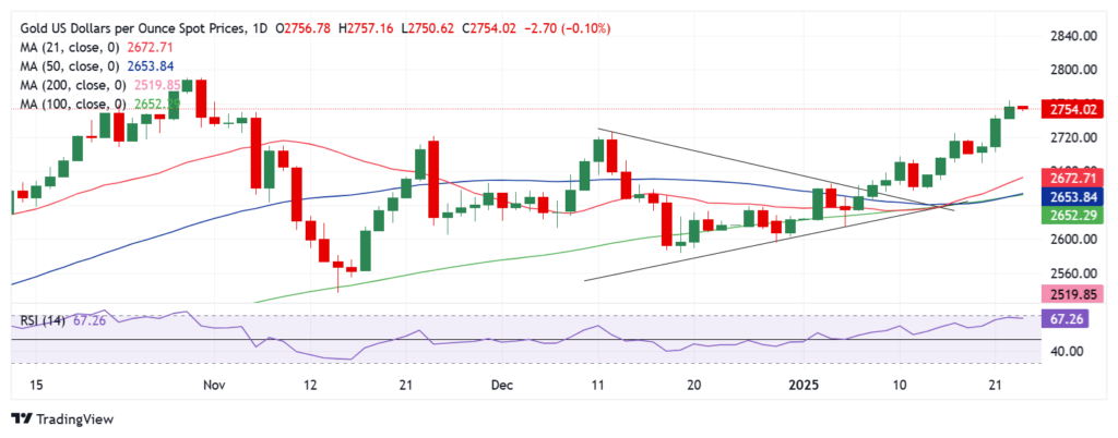 短期来看,金价保持看涨潜力,并有望测试 2790 美元的历史高点或对称三角形目标 2785 美元。本月早些时候,金价呈现对称三角形突破,同时稳居所有主要每日简单移动平均线之上,支持看涨观点。14 天相对强弱指数位于超买区域下方,目前接近 67,支持进一步上涨。金价必须寻求每日收盘价高于 2024 年 11 月高点 2762 美元,才能接近上述阻力位 2790 美元附近的下一个目标。