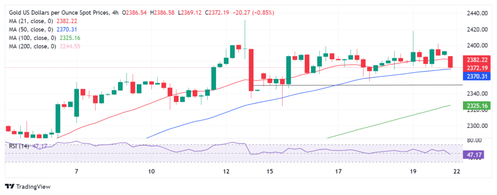 从四小时图上可以看出,金价已突破 21 日移动平均线 2382 美元,挑战下一个关键支撑位 2370 美元(50 日移动平均线)。四小时线收盘价低于后者可能会引发新的下跌趋势,朝向 100 移动平均线 2325 美元。 不过,黄金卖家需要提前突破 2350 美元的心理关口。领先指标相对强弱指数rsi已进入负值区域,徘徊在 48.00 附近,证明了看跌潜力。