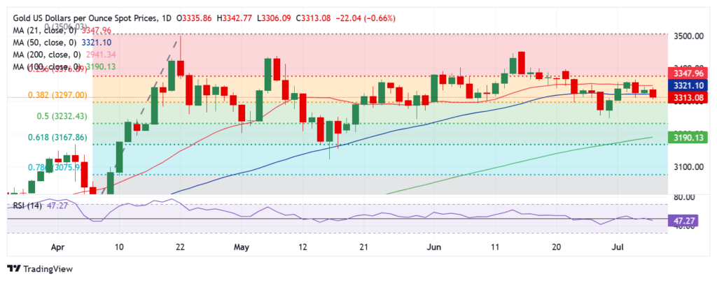 金价再次在 21 日均线 $3,350 点上方遭遇阻力,并突破了 50 日均线 $3,321 点的支撑。14 日 RSI 指标在中线下方走低,目前位于 47 点附近,表明金价将有更多下行空间。