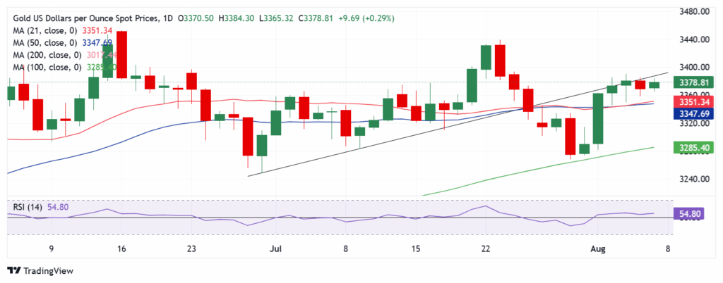 如果买盘势头增强,金价可能会持续突破上升趋势线支撑位转阻力位 $3,387,接近八天高点 $3,390。