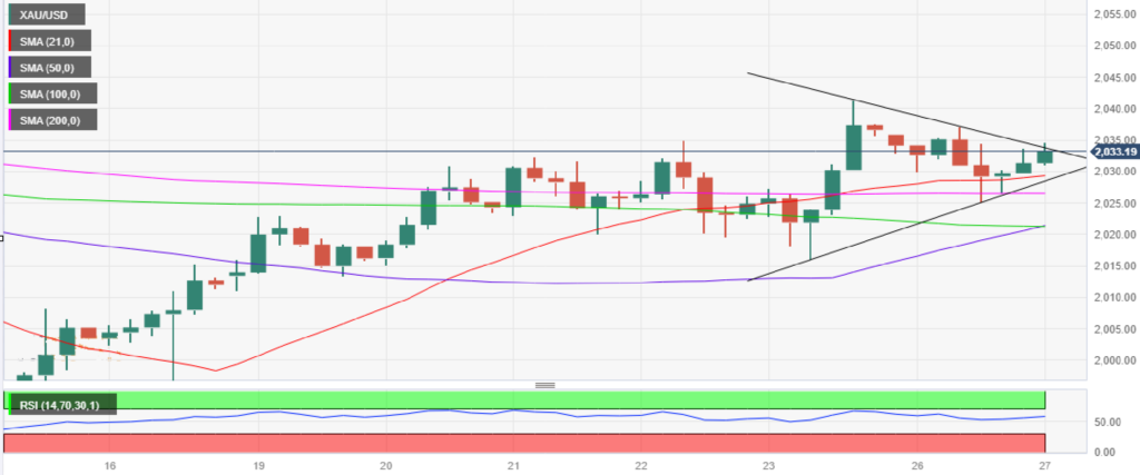 从四小时图表中可以看出,金价正在从三角旗形态向上突破,测试下降趋势线阻力位 2034 美元。需要在四小时线收盘基础上接受高于该水平才能确认看涨突破。50-sma 指标正在寻求突破 100 移动平均线以实现上行。 如果发生这种情况,它将验证牛市金叉。