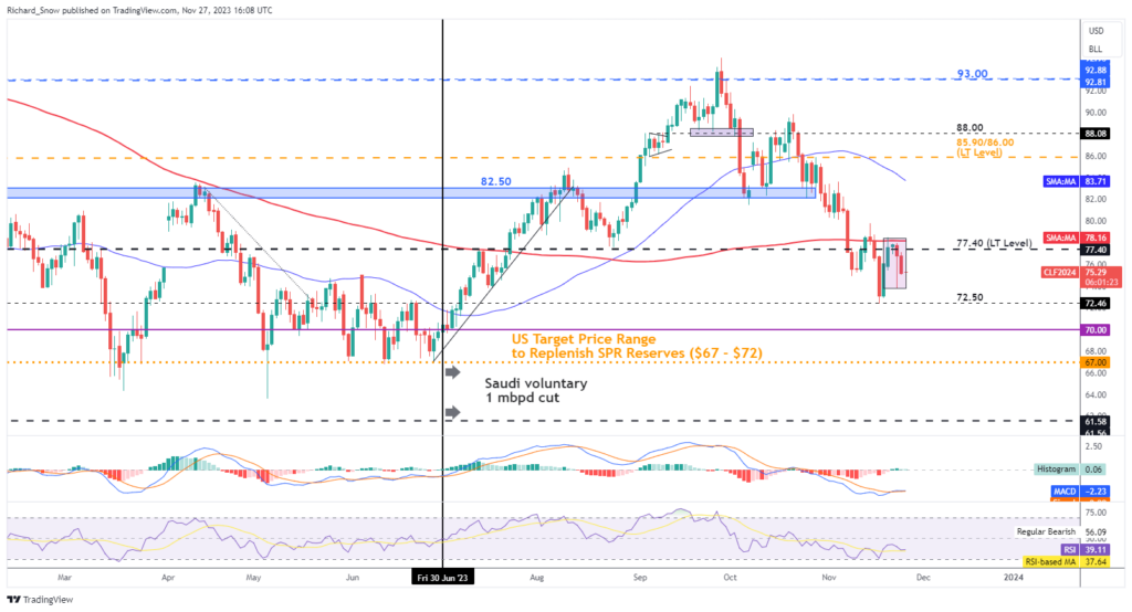 上周三,在石油输出国组织决定将会议推迟到本周四的消息传出后,布伦特原油价格波动尤为剧烈。欧佩克+将于周四开始会议,该集团目前正在权衡将减产延长至2024年的选择,有报道甚至暗示,鉴于油价走弱,将采取更激进的减产措施。