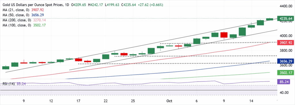 黄金周三收于$4,200门槛之上,周四早盘继续保持创纪录的升势。