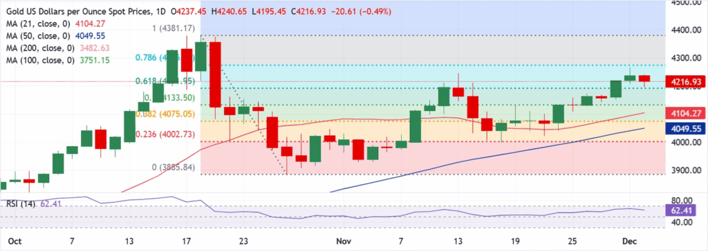 在日线图中,XAU/USD 的交易价格为 $4,216.92。21 日均线攀升至 50 日、100 日和 200 日均线上方,所有均线均呈上升趋势,价格维持在这些均线上方。这种排列强调了持续的看涨势头,$4,104.27 附近的 21 日均线提供了附近的动态支撑。位于 $4,049.55 的 50 日均线加强了市场下方的支撑。.