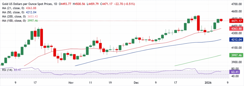 周三早些时候,黄金从$4,500的周内高点回调,因为在全球地缘政治冲突和美国联邦储备委员会(US Federal Reserve)下调2026年利率的押注增加的支撑下,买家们在近期的持续上涨后稍事喘息。.