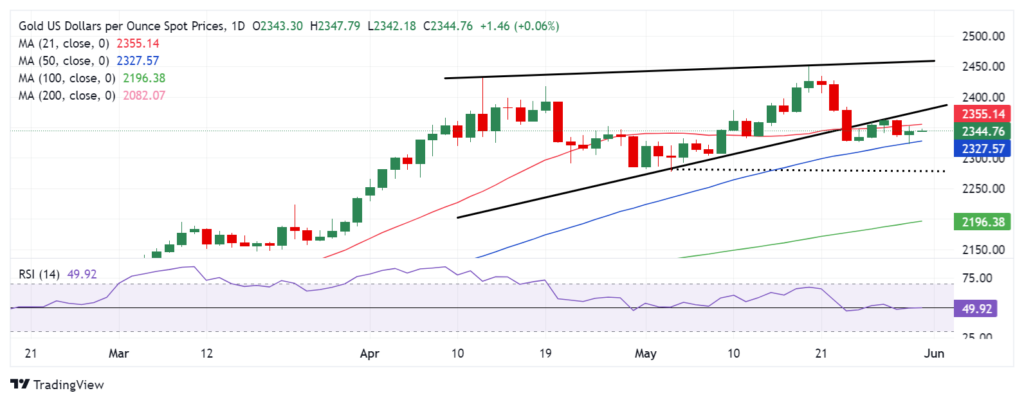 从日线图上看,金价反弹仍受制于21日简单移动平均线 (SMA) 2355 美元以下。与此同时,买家继续捍卫关键的 50 日 SMA 支撑位 2328 美元。14 日相对强弱指数RSI触及50水平,表明金价缺乏明确的方向性。