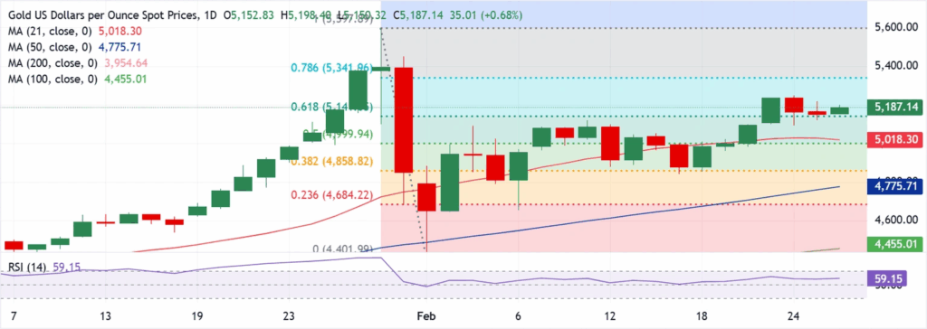 在日线图上,XAU/USD的交易价为$5,187.14。由于价格守在 $5,020 附近的 21 日均线和 $4,775 附近的 50 日均线上方,同时受到下方不断上升的 100 日和 200 日均线的良好支撑,近期走势温和看涨。RSI 指数为 59,在没有超买压力的情况下保持了积极的势头,表明买方在消化了 4 月份的过度超买读数后仍保持了控制权。价格还位于 61.8% 点上方。 斐波那契 从 $4,401 点至 $5,598 点的涨势来看,回撤位在 $5,141 点,这表明最近的回撤已被控制在一个标准的修正区域内。.