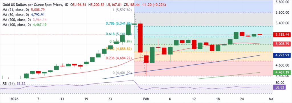 由于现货价维持在 21 天和 50 天简单移动均线 (SMA) 上方,且这两条均线均呈上升趋势,高于上升的 100 天和 200 天 SMA,巩固了已确立的上升趋势,因此近期走势依然看涨。价格还位于从 $4,401.99 低点到 $5,597.89 高点之间的 61.8% 斐波那契回撤位 $5,141.05 以上,表明买方正在捍卫更广泛走势中相对较浅的修正。相对强弱指数(RSI)徘徊在 59 附近,保持积极势头,但没有超买迹象。.