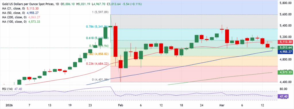 近期走势温和看涨,价格略高于 $4,955 附近的 50 日均线,也略高于 $4,575 和 $4,060 附近的 100 日和 200 日均线。$5,115 附近的 21 日均线已经走平,但仍在现货上方徘徊,表明在更广泛的上升趋势中出现了浅度盘整,而非全面反转。47 点的 RSI 指数仍接近中性中线,表明动能已经降温,但并未明显转向有利于卖方。.