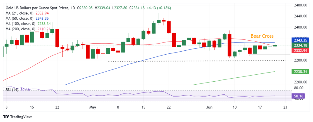 本周到目前为止,黄金价格仍处于熟悉的区间内,卖家拒绝放弃。黄金价格在 2340 美元附近面临强劲阻力,这是 21 日简单移动平均线和 50 日简单移动平均线的交汇区。与此同时,下行空间似乎受到 2300 美元关口的保护。