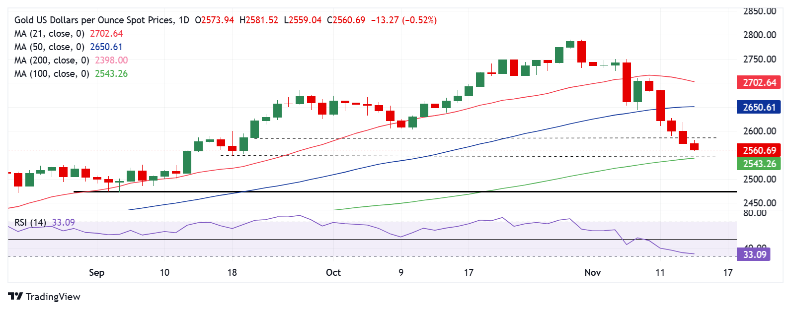 - 由于每日 RSI 保持看跌态势,捍卫 2,545 美元附近的 100 日 SMA 对黄金买家来说至关重要。