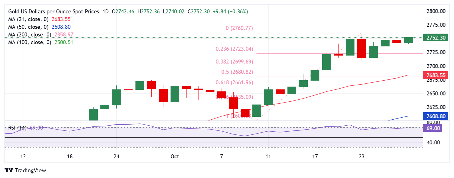 从日线图上可以看出,金价已进入盘整阶段,其上行空间受到 10 月 23 日创下的历史高点 2,759 美元的限制,而买家继续在 2,723 美元(黄金的 23.6% 斐波那契回撤位 (Fibo) 水平)找到需求。最新创纪录的涨幅从 10 月 10 日的低点 2,604 美元上涨至历史高点 2,759 美元。