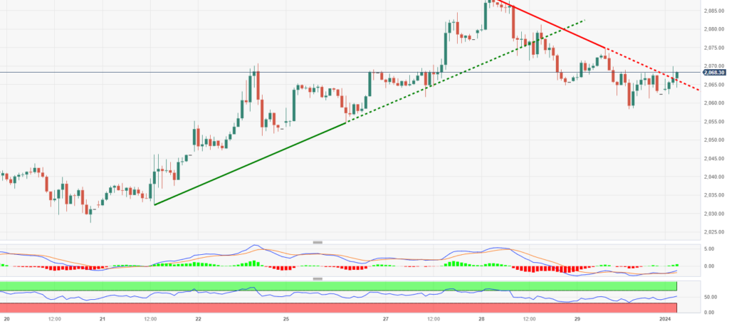 趋势回顾:Gold begins the first trading day of 2024 on a positive note during the early Asian session on Tuesday. The uptick of yellow metal is supported by the softer US Dollar and the positive development surrounding China’s economic stimulus measure. XAU/USD price trades around $2,065, up 0.19% on the day.